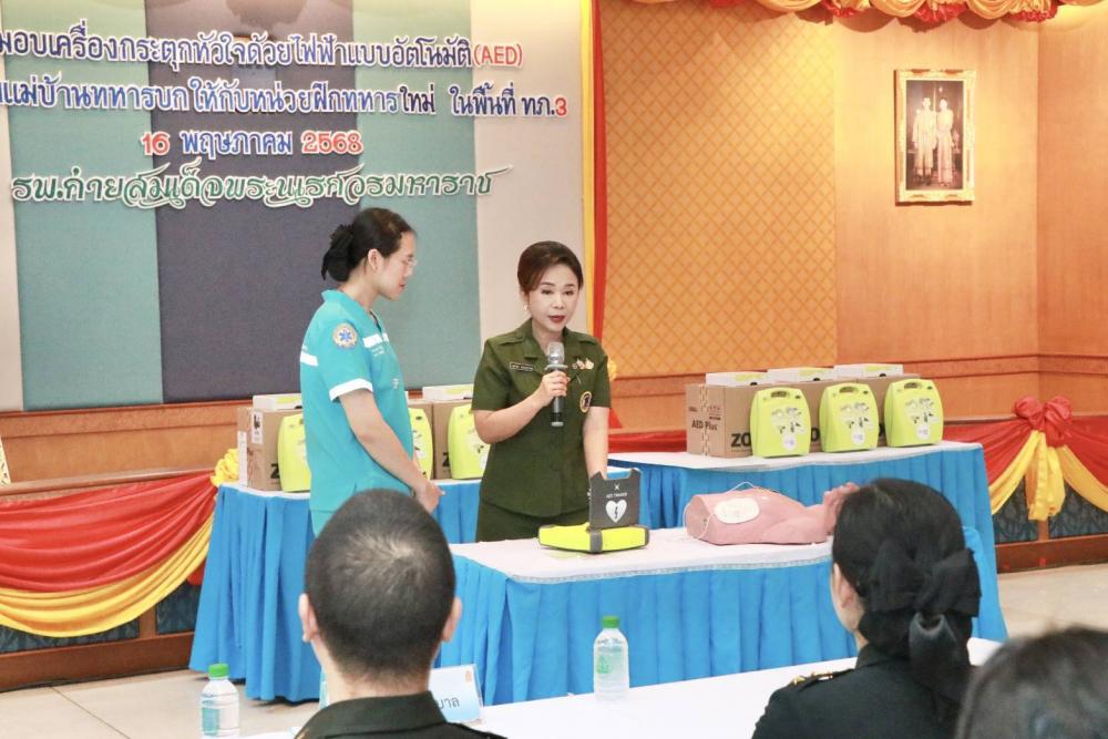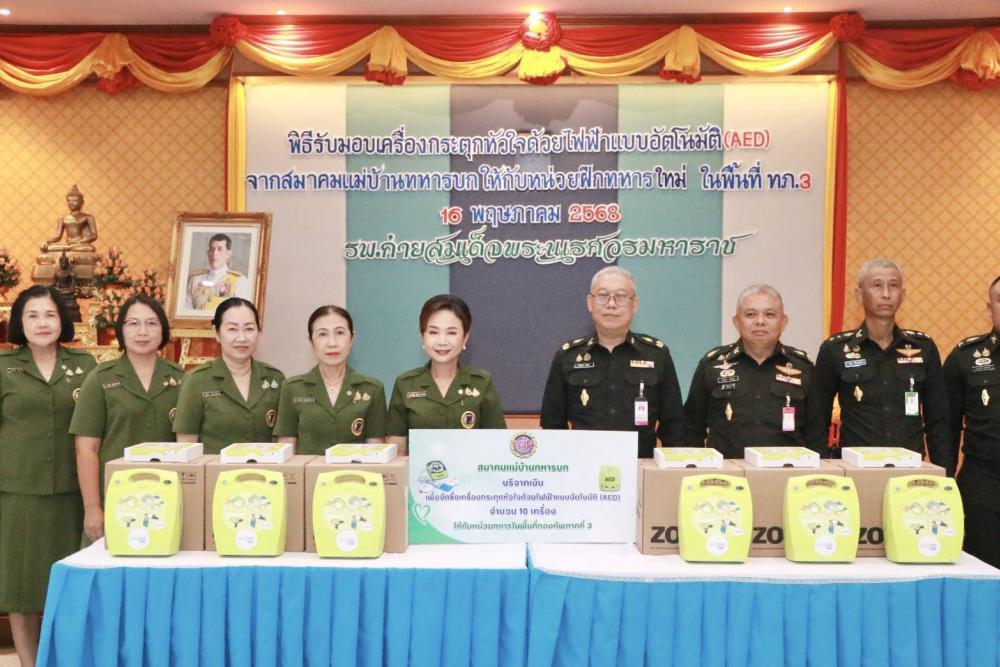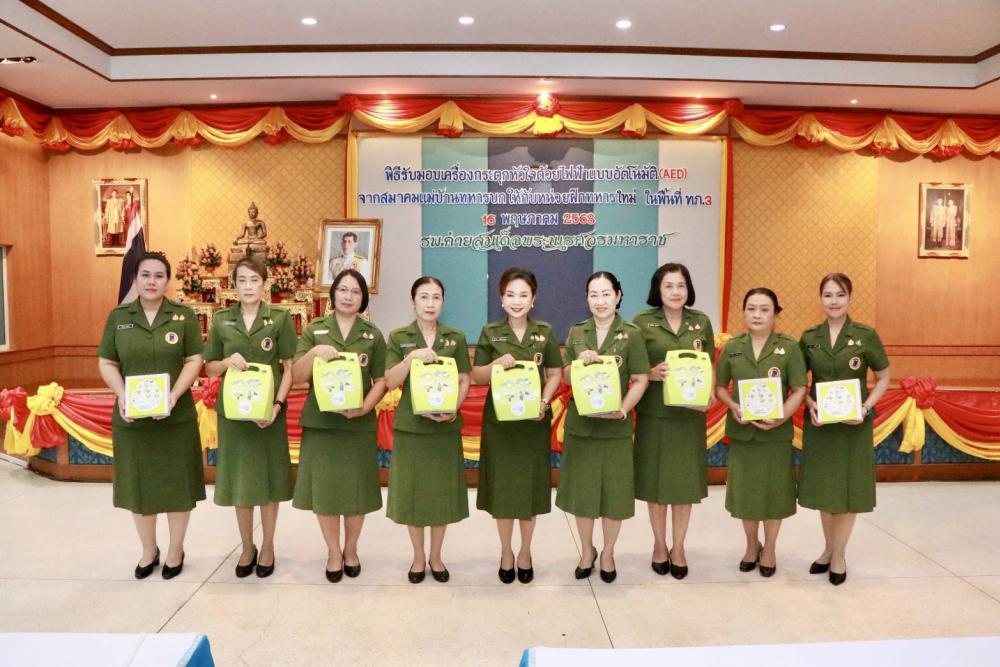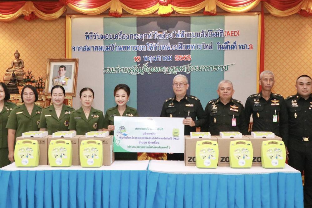 เมื่อวันศุกร์ที่ 16 พฤษภาคม 2568 เวลา 1000 พันเอกหญิง สุชาดา แจ่มสุวรรณ และคณะ เป็นผู้แทนสมาคมแม่บ้านทหารบก มอบเครื่องกระตุกหัวใจด้วยไฟฟ้าแบบอัตโนมัติ (AED) ซึ่งสมาคมแม่บ้านทหารบก ได้บริจาคเงินให้กับ"กองทุนโรงพยาบาลค่ายสมเด็จพระนเรศวรมหาราช" ซึ่งมี พลตรี ปิยลาภ วสุรัต ผู้อำนวยการโรงพยาบาลค่ายสมเด็จพระนเรศวรมหาราช เป็นผู้รับมอบ ทั้งนี้วัตถุประสงค์ของการบริจาคเงิน เพื่อนำไปจัดซื้อเครื่องกระตุกหัวใจด้วยไฟฟ้าแบบอัตโนมัติ (AED) จำนวน 10 เครื่อง แล้วส่งมอบให้กับหน่วยในพื้นที่กองทัพภาคที่ 3 ที่ยังขาดแคลน สำหรับไว้ใช้เมื่อประสบเหตุฉุกเฉิน เพื่อเป็นการเพิ่มโอกาสในการรอดชีวิต จากภาวะหัวใจวายเฉียบพลันต่อไป