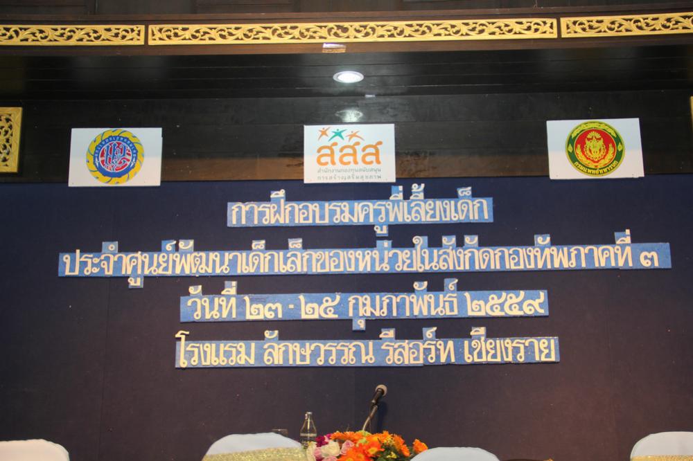 เมื่อวันพุธที่ ๒๔ มีนาคม ๒๕๕๙ พลตรีหญิง บุญรักษา นาควานิช นายกสมาคมแม่บ้านทหารบก, คุณจุรีภรณ์ นิลบรรเจิดกุล ประธานสมาคมแม่บ้านทหารบก สาขา กองทัพภาคที่ ๓ และคณะ เยี่ยมชมโครงการฝึกอบรมครูพี่เลี้ยงเด็กประจำศูนย์พัฒนาเด็กเล็กของหน่วยในสังกัดกองทัพภาคที่ ๓ ซึ่งจัดขึ้นระหว่างวันที่ ๒๓-๒๕ กุมภาพันธ์ ๒๕๕๙ ณ โรงแรมลักษวรรณ รีสอร์ท เชียงราย