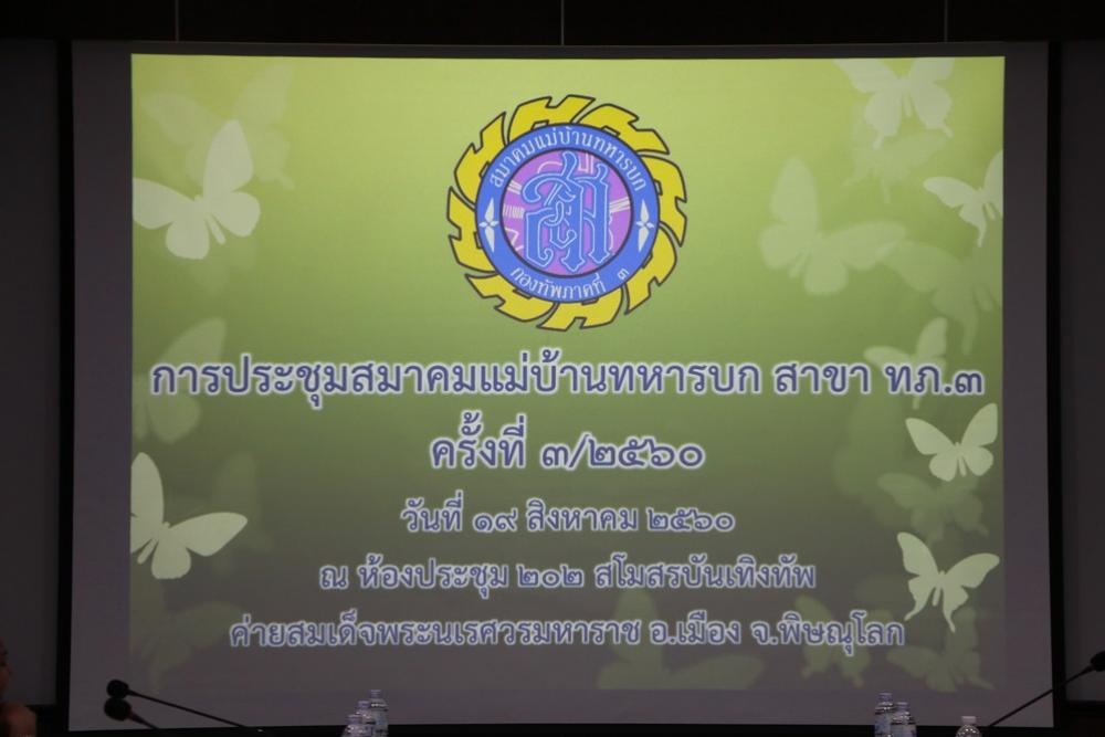 เมื่อวันเสาร์ที่ ๑๙ สิงหาคม ๒๕๖๐ คุณสุภาพ สิริบรรสพ ประธานสมาคมแม่บ้านทหารบก สาขากองทัพภาคที่ ๓ เป็นประธานการประชุม สมาชิกสมาคมแม่บ้านทหารบก สาขา กองทัพภาคที่ ๓ ครั้งที่ ๓/๒๕๖๐ ณ ห้องประชุม ๒๐๒ สโมสรบันเทิงทัพ ค่ายสมเด็จพระนเรศวรมหาราช อำเภอเมือง จังหวัดพิษณุโลก