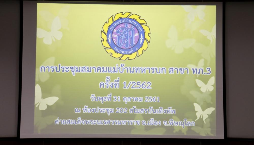 เมื่อวันพุธที่ ๓๑ ตุลาคม ๒๕๖๑ คุณ ศิริพร ชัยยะคำ ประธานสมาคม ประธานสมาคมแม่บ้านทหารบก สาขา กองทัพภาคที่ ๓ เป็นประธานการประชุมสมาคมแม่บ้านทหารบก สาขา กองทัพภาคที่ ๓ ครั้งที่ ๑/๒๕๖๒ ณ ห้องบันเทิงทัพ ๑๐๑ สโมสรบันเทิงทัพ ค่ายสมเด็จพระนเรศวรมหาราช อำเภอเมือง จังหวัดพิษณุโลก