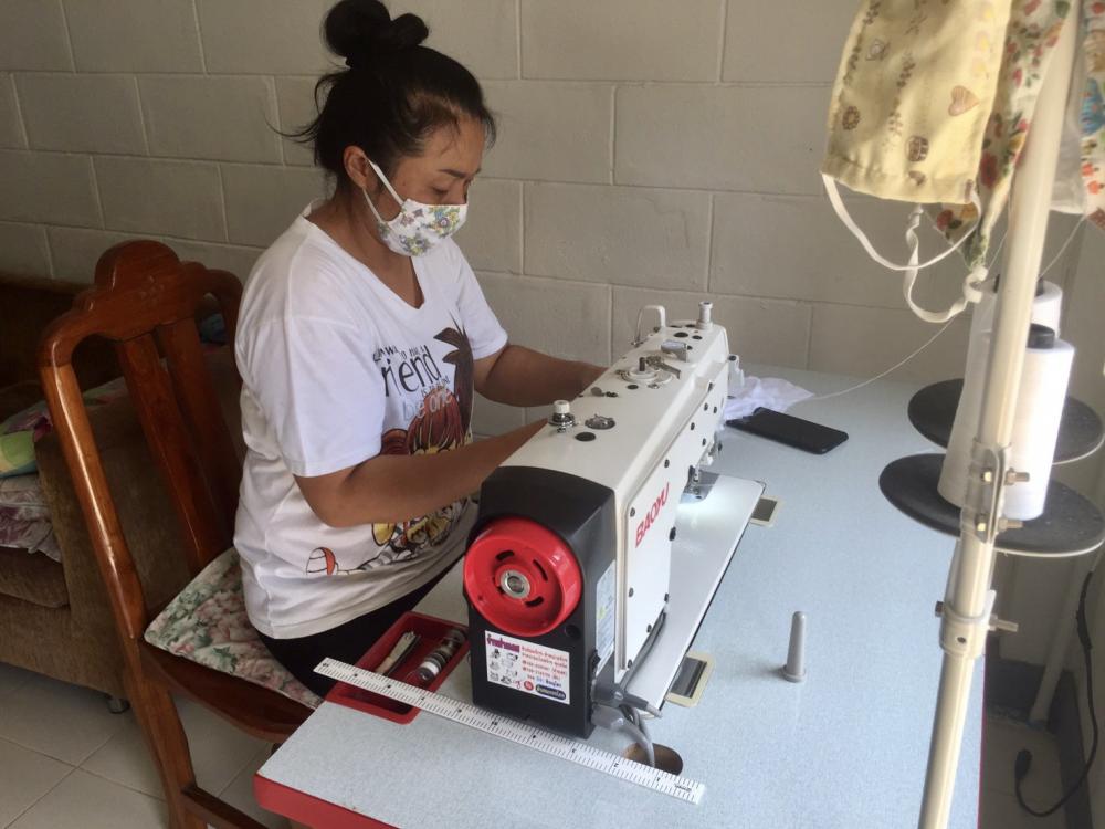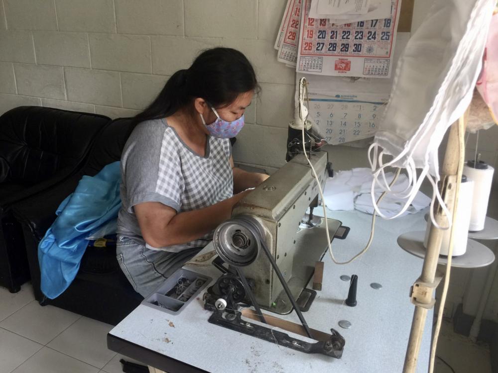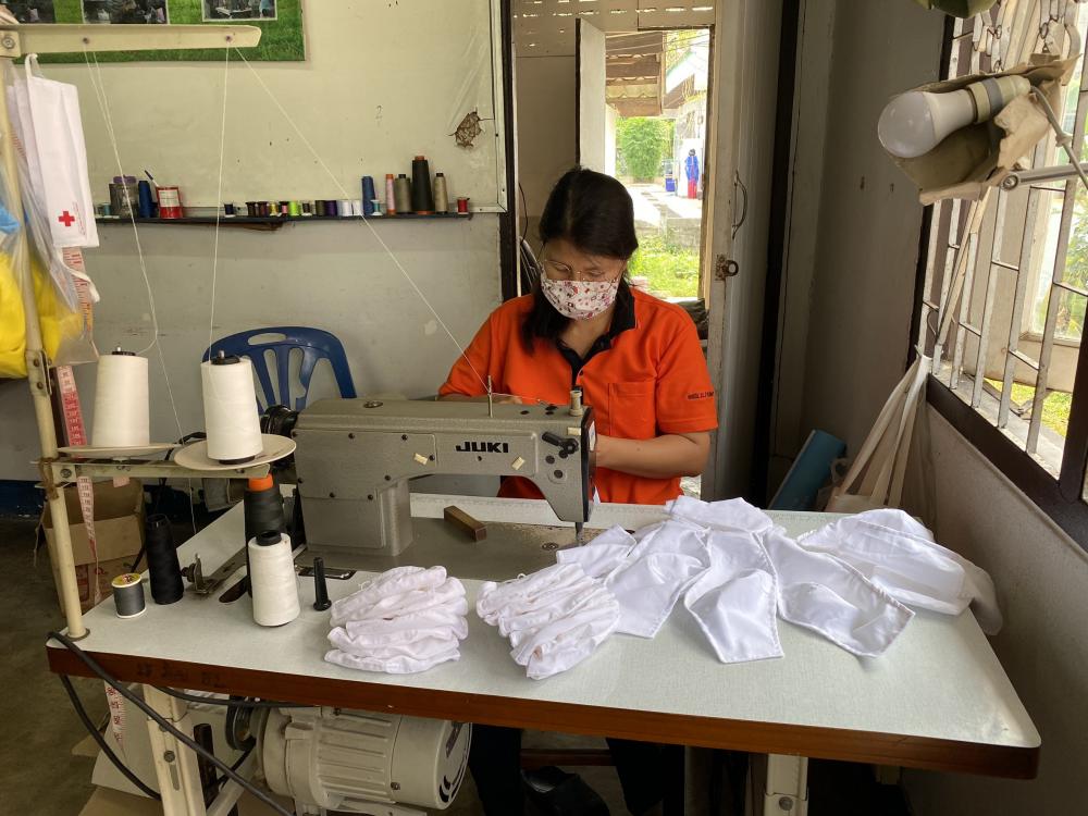 ประธานสมาคมแม่บ้าน ทบ. สาขา ส.พัน.๔ พล.ร.๔ ตัดเย็บหน้ากากอนามัยจากผ้ามัสลินที่ได้รับมอบจาก ทภ.๓ เพื่อแจกจ่ายให้กับ กำลังพล ครอบครัว และชุมชนรอบค่าย