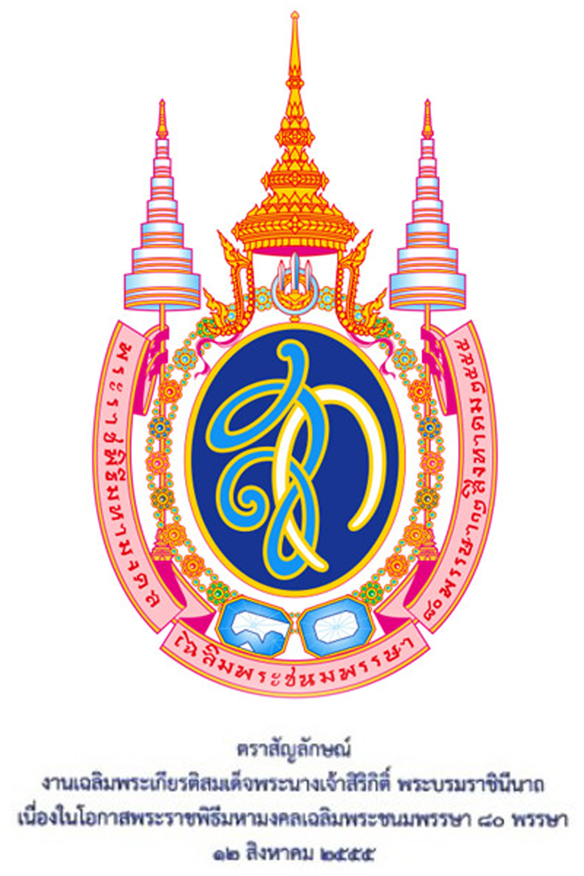 แบบตราสัญลักษณ์ ประกอบด้วย อักษรพระนามาภิไธย ส.ก. อยู่ภายในวงรี ด้านบนวงรีเป็นพระมหามงกุฎ ภายในพระมหามงกุฎเป็นพระแสงจักรและพระแสงตรีศูล มีเครื่องราชอิสริยาภรณ์โบราณมงคลพระมหาสังวาลนพรัตนราชวราภรณ์ล้อมรอบวงรี ขนาบข้างด้วยพระสัปตปฏลเศวตฉัตร ด้านล่างวงรีเป็นเลขไทย ๘๐ อยู่ในรูปทรงของเพชร ด้านล่างเลขไทย ๘๐ เป็นผ้าแพรแถบอักษรข้อความ พระราชพิธีมหามงคลเฉลิมพระชนมพรรษา ๘๐ พรรษา ๑๒ สิงหาคม ๒๕๕๕ ในการพระราชพิธีบรมราชาภิเษก วันที่ ๕ พฤษภาคม ๒๔๙๓ พระบาทสมเด็จพระเจ้าอยู่หัว ทรงพระกรุณาโปรดเกล้าฯ สถาปนาสมเด็จพระราชินี เป็นสมเด็จพระนางเจ้าสิริกิติ์ พระบรมราชินีนาถ แล้วพระราชทานเครื่องราชอิสริยาภรณ์ อันเป็นโบราณมงคลนพรัตนราชวราภรณ์ พระมหามงกุฎ : เครื่องประกอบพระราชอิสริยยศของสมเด็จพระบรมราชินีนาถ พระสัปตปฎลเศวตฉัตร : เป็นเครื่องประกอบพระราชอิสริยศักดิ์ พระแสงจักรและพระแสงตรีศูล : เครื่องหมายแห่งพระบรมราชจักรีวงศ์ เลขไทย ๘๐ : พระชนมพรรษา ๘๐ พรรษา ผ้าแพรแถบสีชมพู : เครื่องราชอิสริยาภรณ์ จุลจอมเกล้า สีน้ำเงิน – สีฟ้า : สีวันพระราชสมภพ